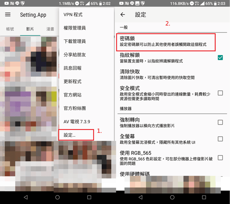 開啟APP後點右上角的 … 開啟『設定…』之後選擇『密碼鎖』,輸入密碼後下次開啟APP後即需要認證,在沒認證通過前是沒有任何APP內容顯示的