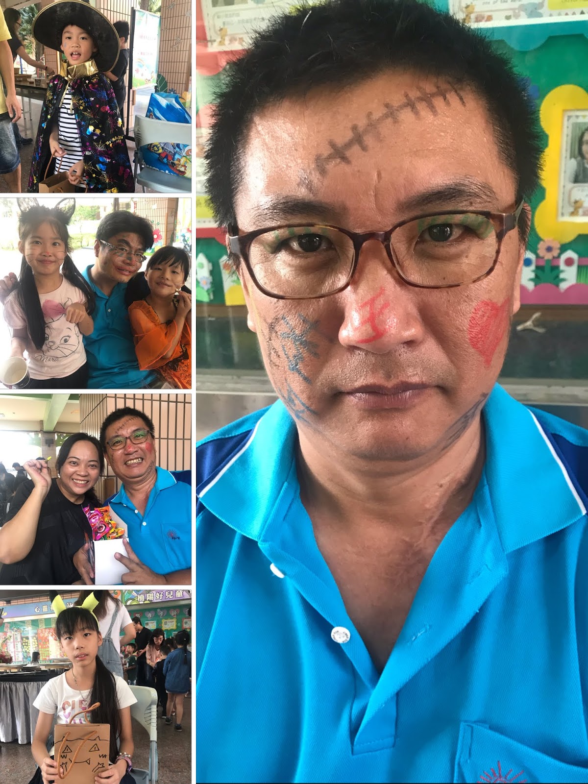 其實大會本想讓大家一來就開始吃吃喝喝,所以想弄個塑膠椅簡單擺著,大家就站著且拿著高腳杯(並沒有酒)到處走來走去交流聊天,但當天場佈想起那校長跟會長們要致詞,大家站著會很辛苦墊腳尖吧!但把致詞者團團圍住聽起來也很怪又不是在圍事,於是在決定還是要有正式椅子時,主任突然間就生出了好多張好坐的靠ㄅ …背椅,這間學校就是這麼樸實無華且有效率,要什麼有什麼,不愧校務蒸蒸日上!大人吃吃喝喝,小孩也沒閒著,也跟著吃吃喝喝然後「順便參加」彩繪活動:一畫萬聖節裝糖禮袋、二畫人臉彩繪: