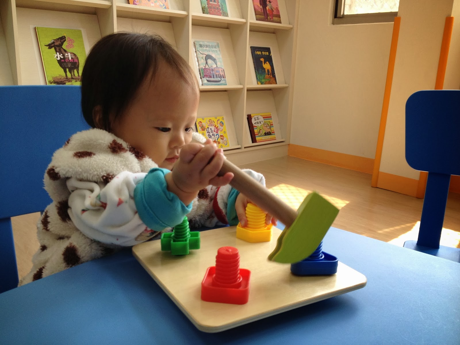 3.感覺統合玩具:有個櫃子存有一堆這種玩具,那天選了這個簡單的(其實是比較難的牽牽沒興趣!)這是個鎖鏍絲的玩具,桌椅則是塑膠製的,而不是印象中木製的。其中可以注意到玩具與桌椅都有作平滑處理,附近的牆則是黏上防撞條,連地板也全都是軟木質地的。