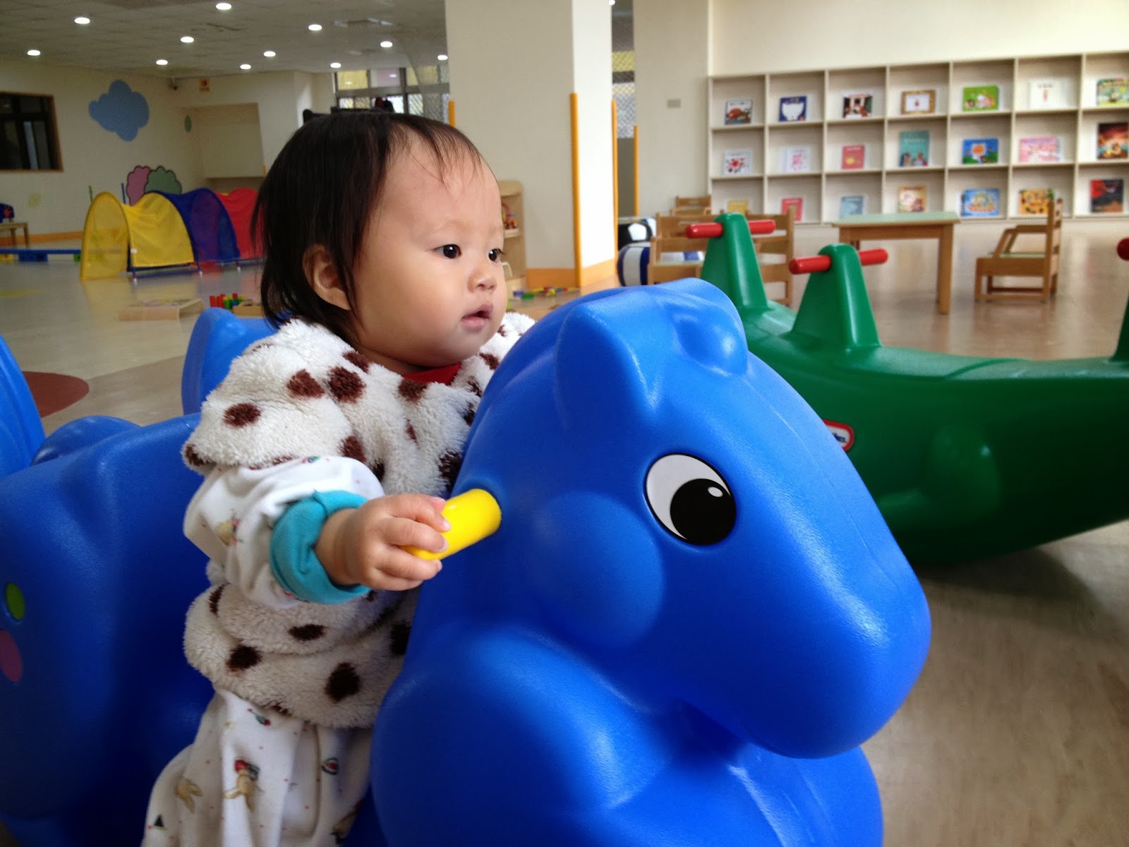 4.搖搖馬。有單人騎獸(馬)跟多人騎獸(鱷魚)。左後方有帳篷山洞區(隨便亂取名)跟右後方的圖書區,這邊的圖書跟玩具一樣,有各學齡的,牽牽媽在那邊津津有味看完了「聖甲蟲與埃及王子」(印象中的書名,有錯請指正)。