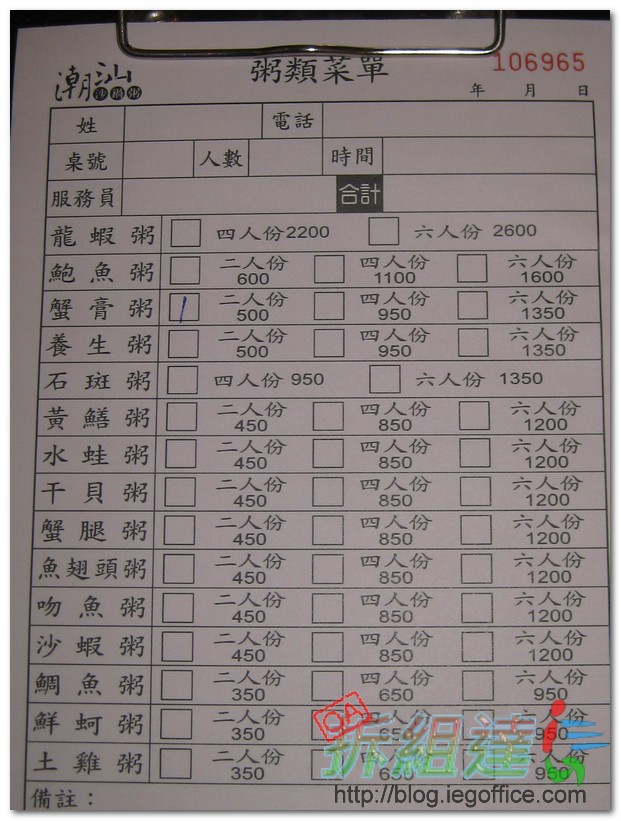 到了潮汕沙鍋粥現場,店員居然說最近比較忙沒有上網看,所以訂位失敗 = =,好在還有空位,只是半個小時的等候恐怕是免不了。因此拆組達人在此誠心建議,要訂位的話千萬電話前不要省啊!另外後來拆組達人才發現官網上有優惠券可以使用,滿三百送一盤黃金豆腐 = =。