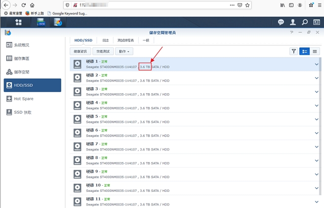 接著我們說明一下,為何在群暉儲存空間管理員看到原本4T的硬碟容量會是3.6T ?