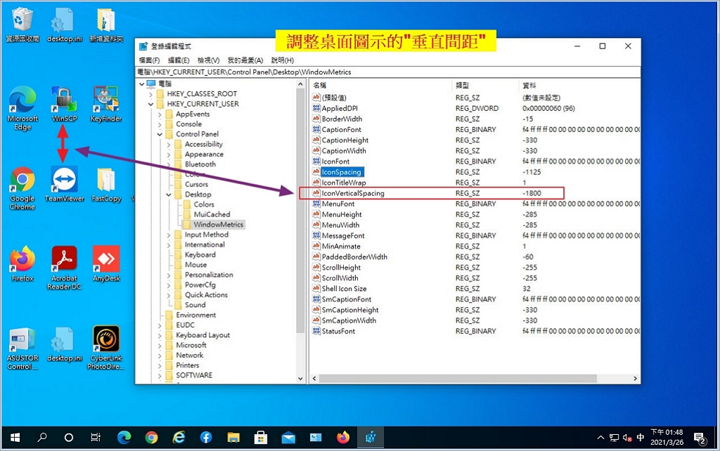 調整「IconVerticalSpacing」參數值,可以變更桌面圖示的垂直間距。