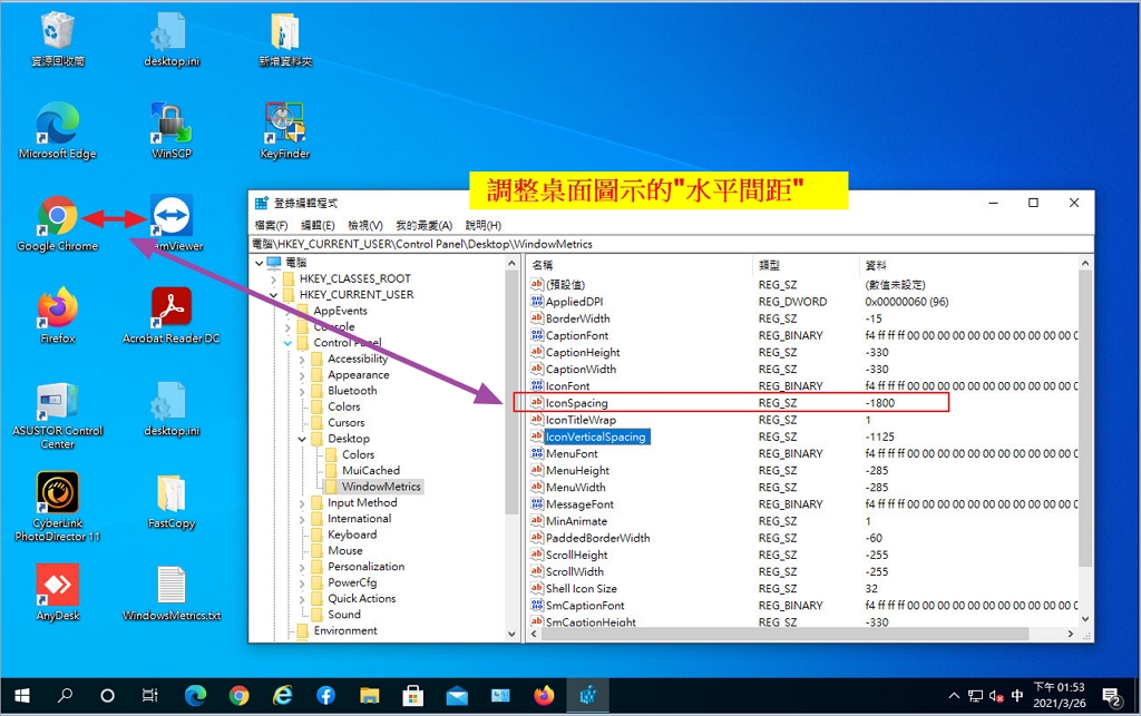 調整「IconSpacing」參數值,可以變更桌面圖示的水平間距。