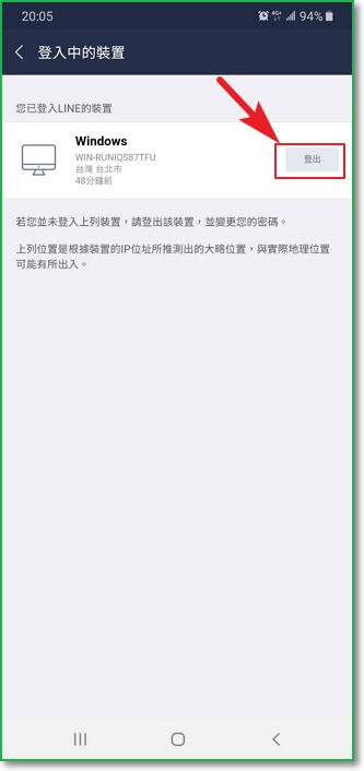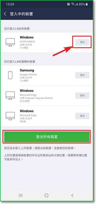 選擇「登出」該裝置;如果你曾經使用網頁版登入 Line當時並未正常登出,你也可以選擇「登出所有裝置」,原則上會保留你目前操作的手機不登出為原則。