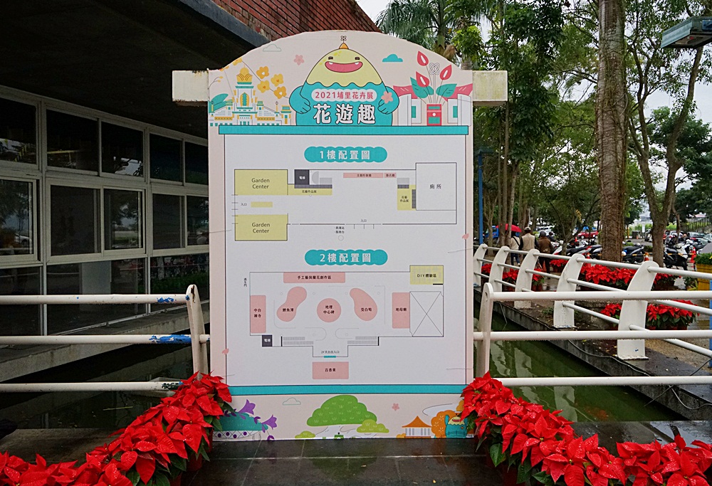 2021埔里花卉展,在展出的右側方也有提供這次展區的配置圖,清楚的知道室內特色主題花卉觀賞區、手工藝與蘭花創作區、蕨類植物展、花卉多肉植栽體驗的地方以及市集、服務台、廁所等區域唷!!