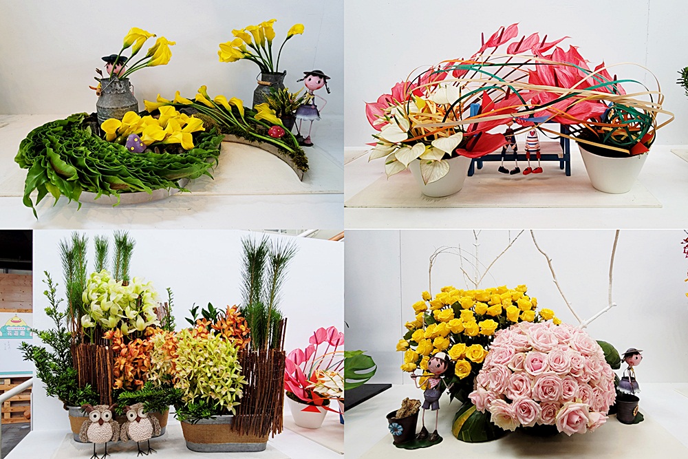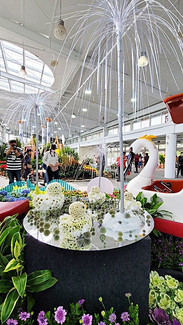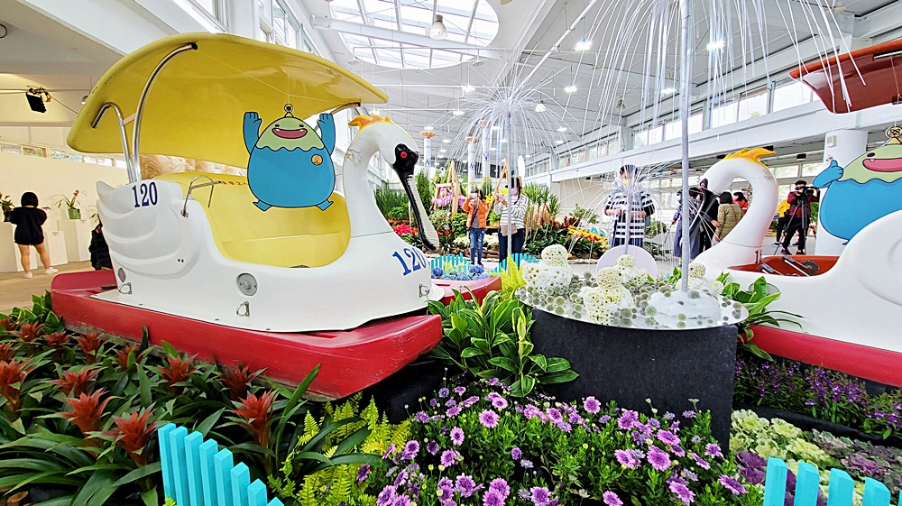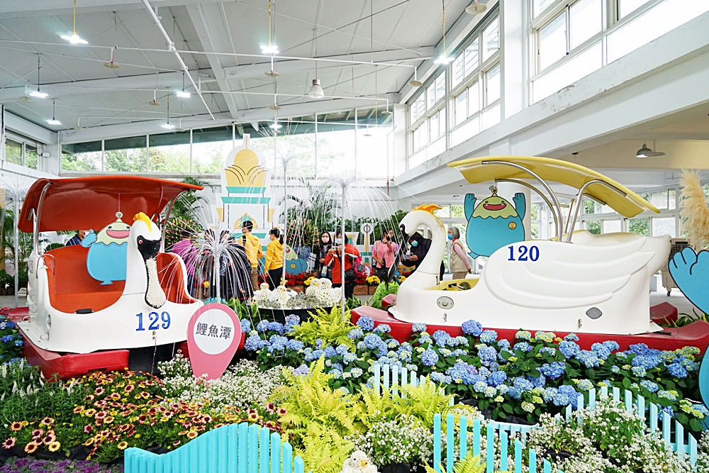 埔里另著名的景點在地理中心碑旁的鯉魚潭,透過天鵝船的意象,將景點的特色帶出來,也能看出花藝老師們的高超花藝..