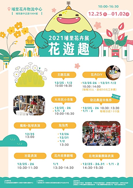 小凉也先提供大家2021埔里花卉展的活動DM,展期為110/12/25~111/01/02、每日10:00~16:30,DM上面都有寫上幾號、幾點有什麼活動,親子玩樂可以好好安排一下!