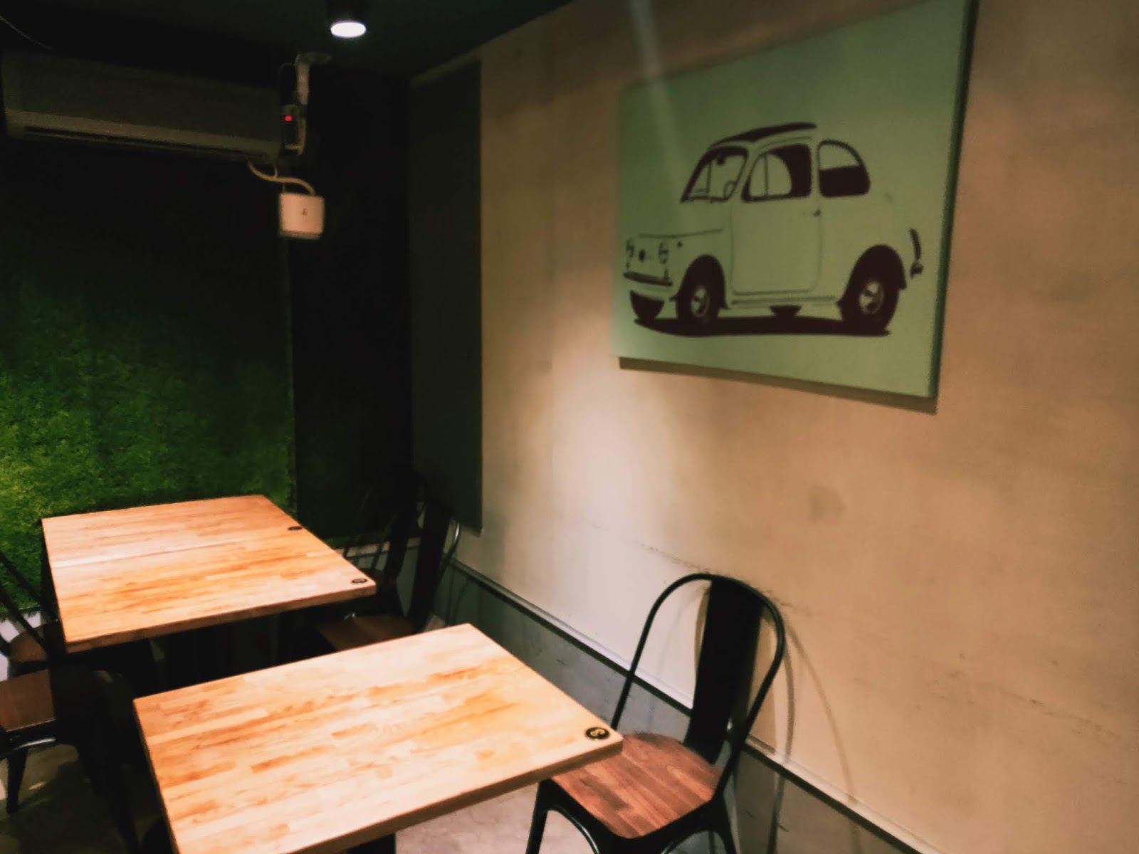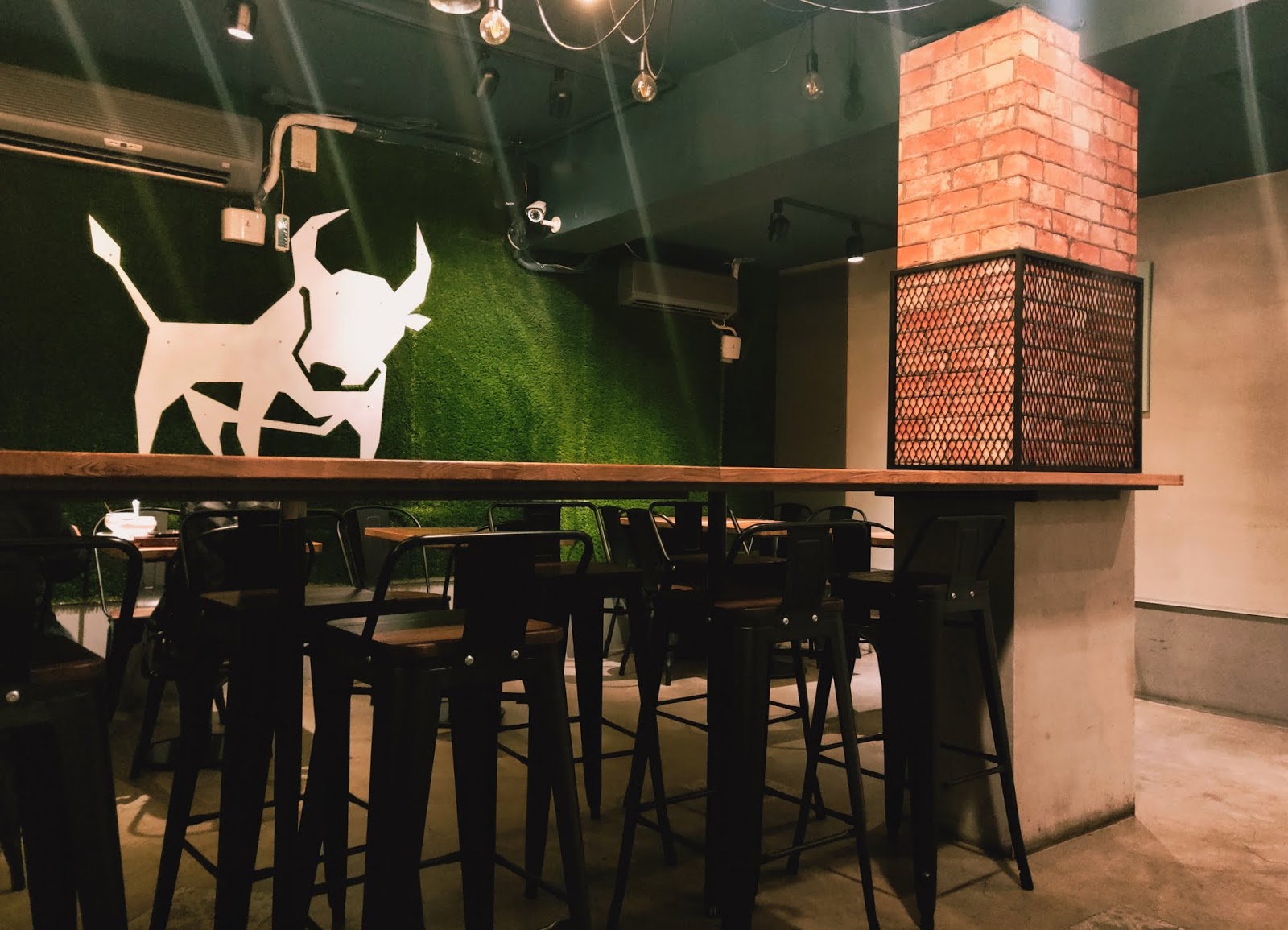 黑牛穆場用白底反黑的招牌,讓LOGO看起來乾淨俐落,很能吸引當下年輕人的目光,裡頭的內裝也跟一般平價牛排不同,一進門口的區域是以紅色仿磚牆來創造溫馨的感覺,用餐區則是用大量的綠色及平滑水泥牆面來創造出一種時尚的工業風,除了一般適合多人的4人方桌外,店中央還擺設有一大塊的原木長桌,搭配俐落的高腳椅,很有俐落的時尚感,頭頂垂吊的圓形黃光燈泡,為著用餐環境帶出一些復古和溫暖的色調,有別於一般死板板的連鎖牛排館。
