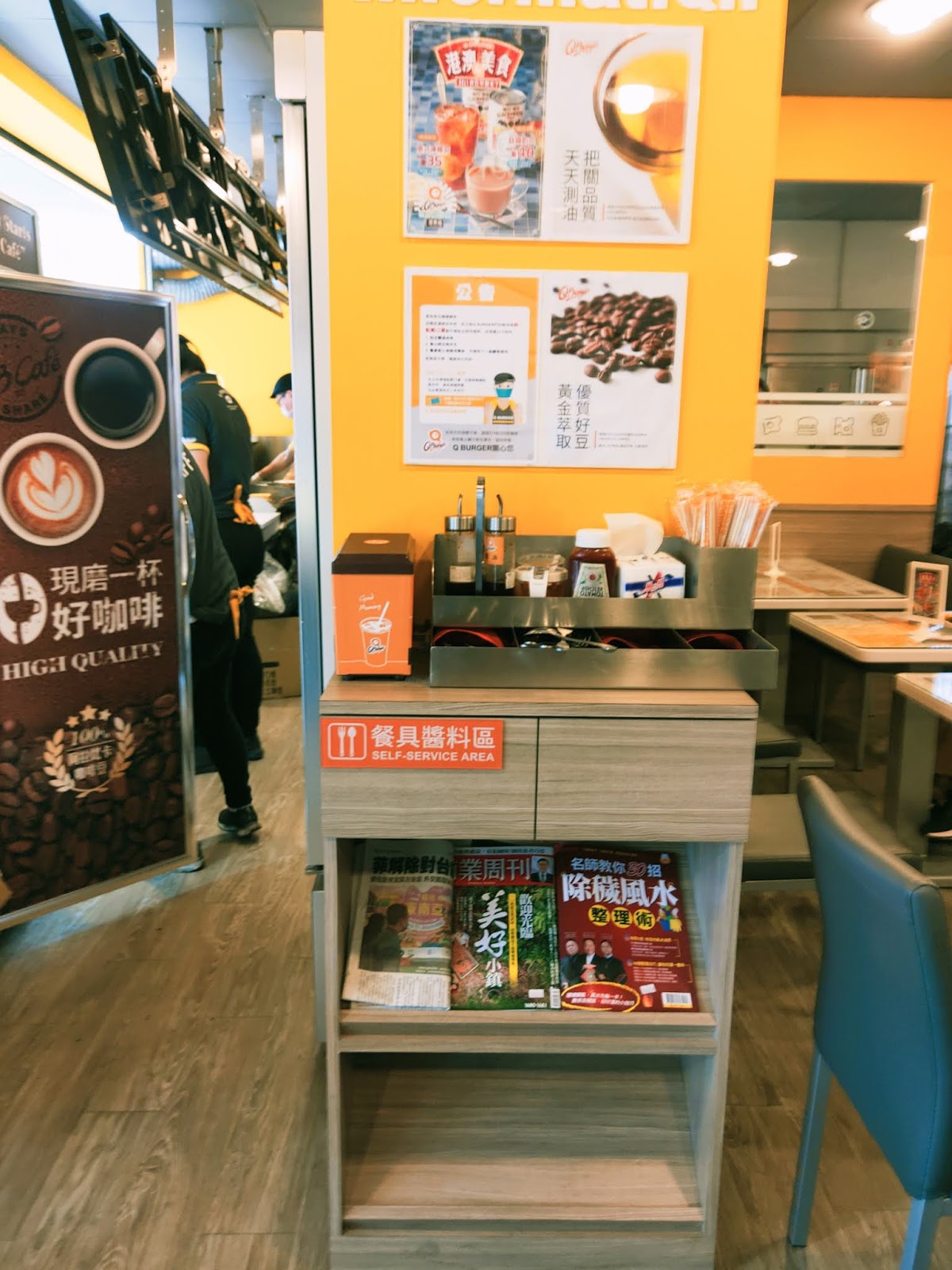 配合Q Burger吉祥物小雞的一致Tone調,整個店面的裝潢以小雞黃為主色調,簡單俐落的色塊在灰面的牆上更具玩味,牆上的海報也凸顯出Q Burger要營造的專注食安的形象,整個用餐環境是乾淨與新穎的,佐料及餐具區在入口處,方便客人自行取用,櫃檯和開放式廚房則在店的另一邊,用透視玻璃牆隔了出來,所以用餐區就不會有太多莫名的味道;就坐,勾選好餐點,到櫃檯結帳(櫃台設計有手搖杯連鎖店的味道),就可以等餐點送上桌囉!!