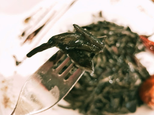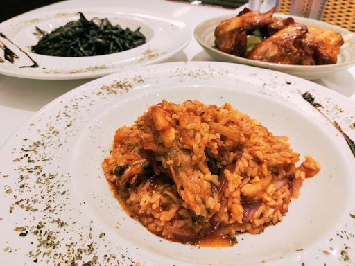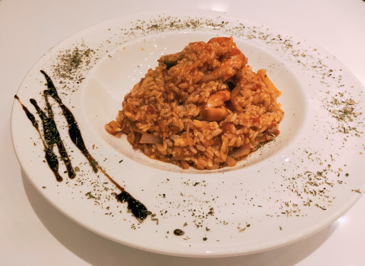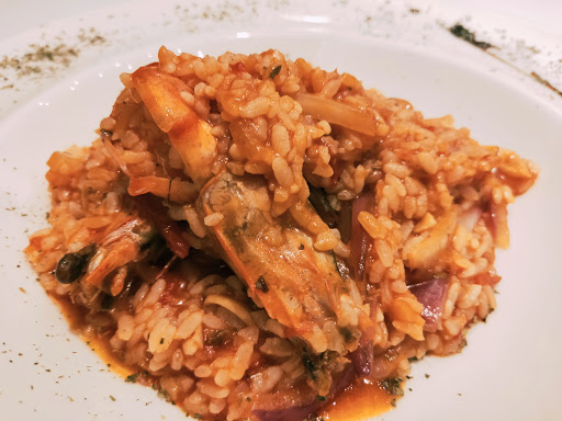 第一天週四晚,我們很幸運的共度了一場很安靜的用餐時刻,從進入到離開,總共4桌客人,點了名字很炫的狠蝦番茄燉飯及墨攻花枝特飛麵,還有一份檸香烤雞翅。