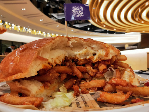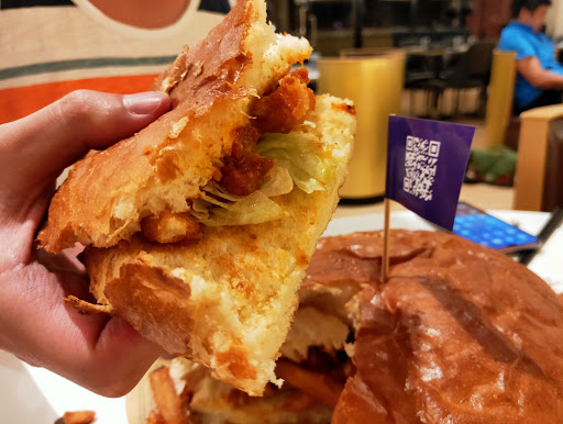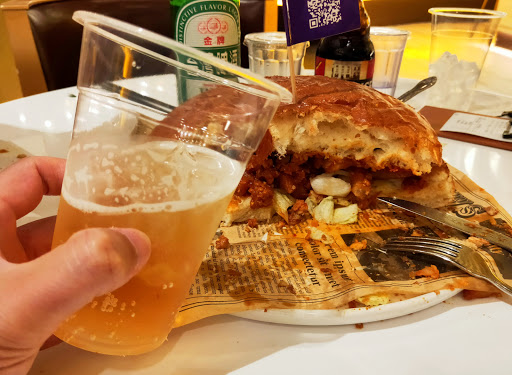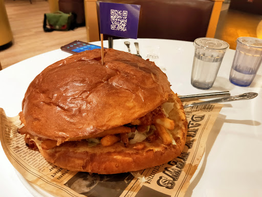 雖然單價只有$198的大薯堡,但份量著實驚人,一上桌就把我們看呆了,老實說,真不知道該如何下手,真的有小面盆那麼大,而且還沉甸甸的,一刀畫下薯條和墨西哥肉醬就流溢出來,雖說是辣醬,只有甜辣醬的等級而已吧! 真的還好沒有多點其他道菜,萬幸喔;漢堡麵包有烤過,溫熱好吃有口感且不軟爛,薯條因為是和著肉醬就不酥脆囉,吃第一口時,真的還蠻有意思的,但要吃完這10寸大小的澱粉,就真的是沒辦法了,就算配上啤酒也吃不完,就這樣被那漢堡上的紫色小旗子給嗆聲了過去!!