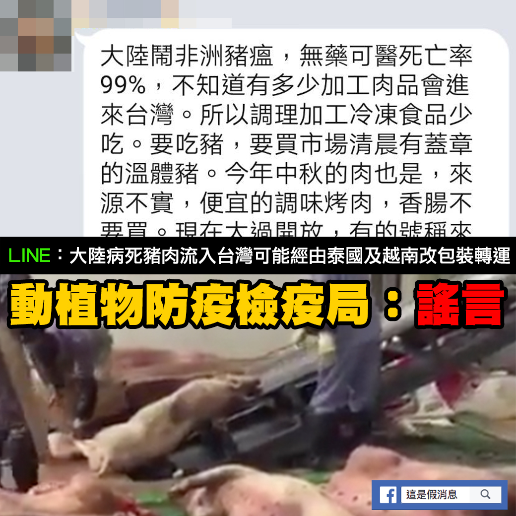 中秋 LINE 傳「大陸鬧非洲豬瘟」、「有的號稱來自泰國越南,極可能是過地改包裝轉出口」,甚至還有影片在訊息中,關於這個謠言動植物防疫檢疫局也出來澄清了,目前台灣沒有開放這些國家進口,同時也不可能經由泰國及越南改包裝轉運到台灣。
