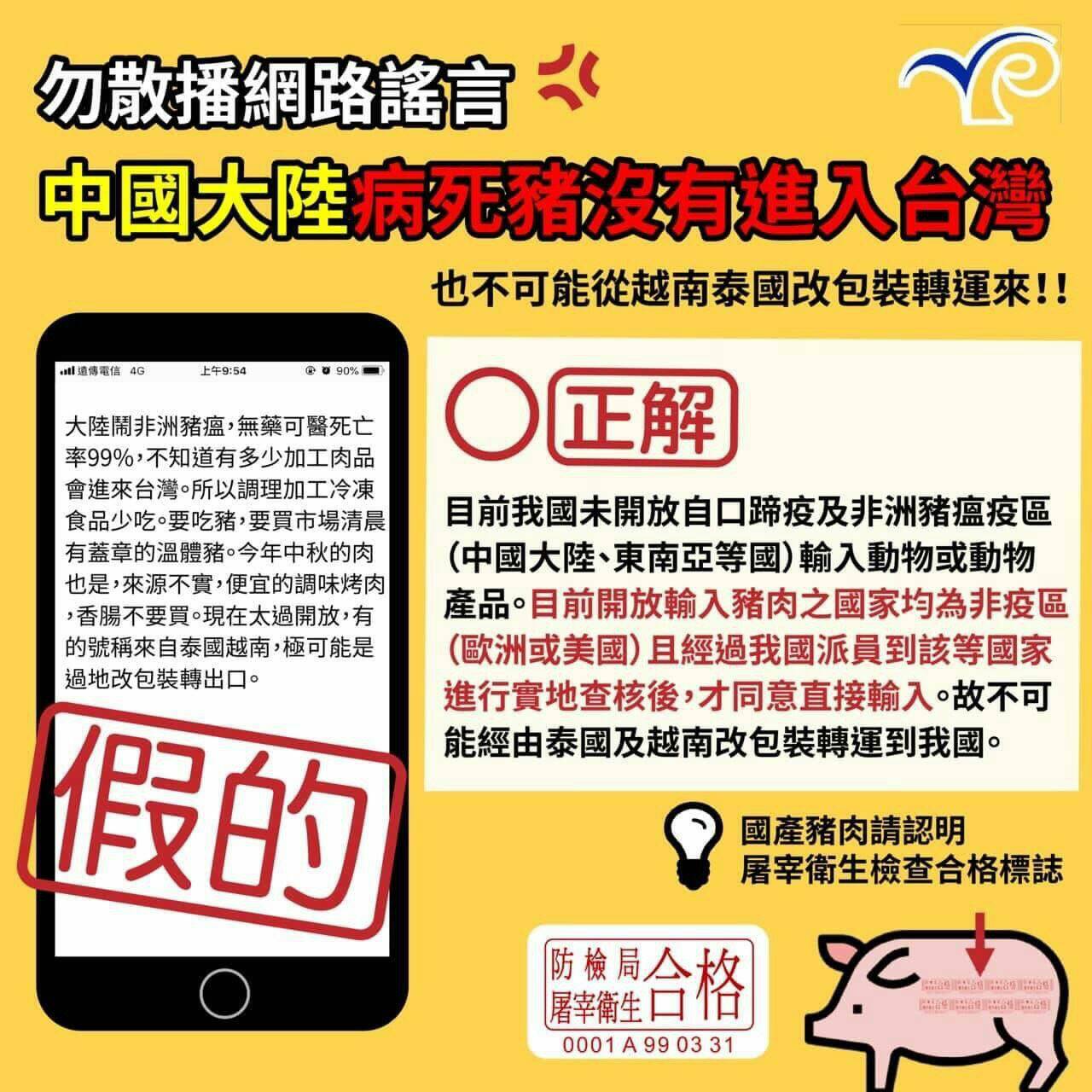 對此動植物防疫檢疫局在官方粉絲專頁上澄清:請勿散播網路謠言!本局在此澄清:絕對沒有!目前我國未開放自口蹄疫及非洲豬瘟疫區(中國大陸、東南亞等國)輸入動物或動物產品。開放輸入豬肉之國家均為非疫區(歐洲或美國)且經過我國派員到該等國家進行實地查核後,才同意直接輸入。故不可能經由泰國及越南改包裝轉運到我國!只要購買國產豬肉,認明屠宰衛生檢查合格標誌,就是沒問題的,請大家多多支持豬農,並認識屠宰衛生檢查合格標誌,中國大陸病死豬肉並沒有流入台灣。
