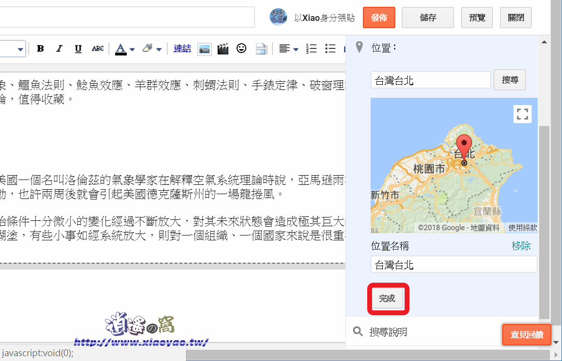 若要排程發文先選定未來日期,點選完成、儲存、關閉,時間到了自動發佈文章。