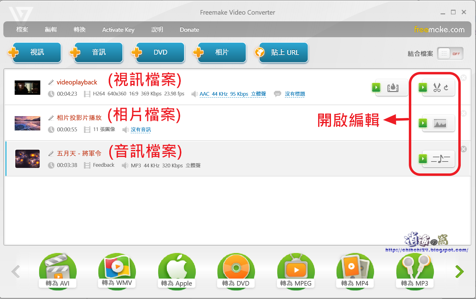 從下方選擇想要轉出的影音格式,可轉出AVI, MP4, WMV, MKV, SWF, 3GP, DVD, MPEG, MP3,同時支援 iPod, iPhone, PSP, Android影音。
