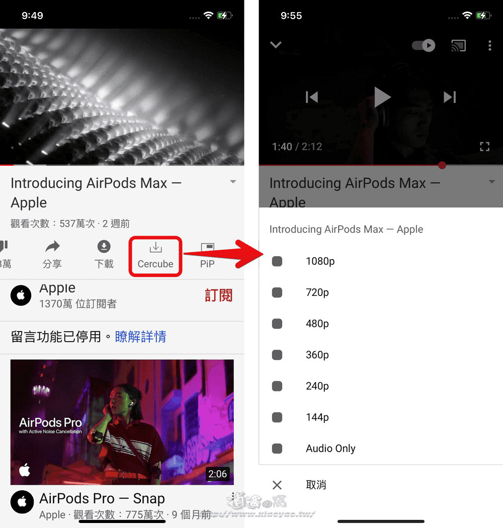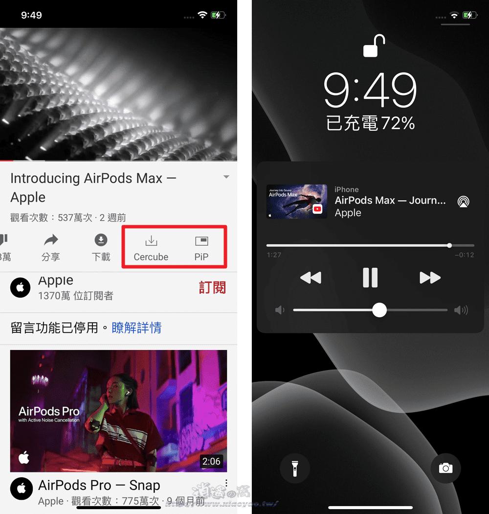 Cercube 5 也支援背景播放可以鎖屏聽音樂,進入影片頁面還有下載、PiP(子母畫面)功能,不過這兩項功能需要登入 Cercube 帳號才能使用。