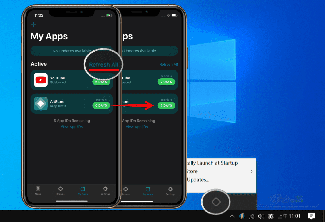 電腦打開 AltServer 軟體(會在背景執行),讓 iPhone 與電腦都連線同一個 Wi-Fi 網路(不用傳輸線),在 AltStore 的 My Apps 頁面點擊「Refresh All」就能替全部 App 重簽恢復七天的使用時間,