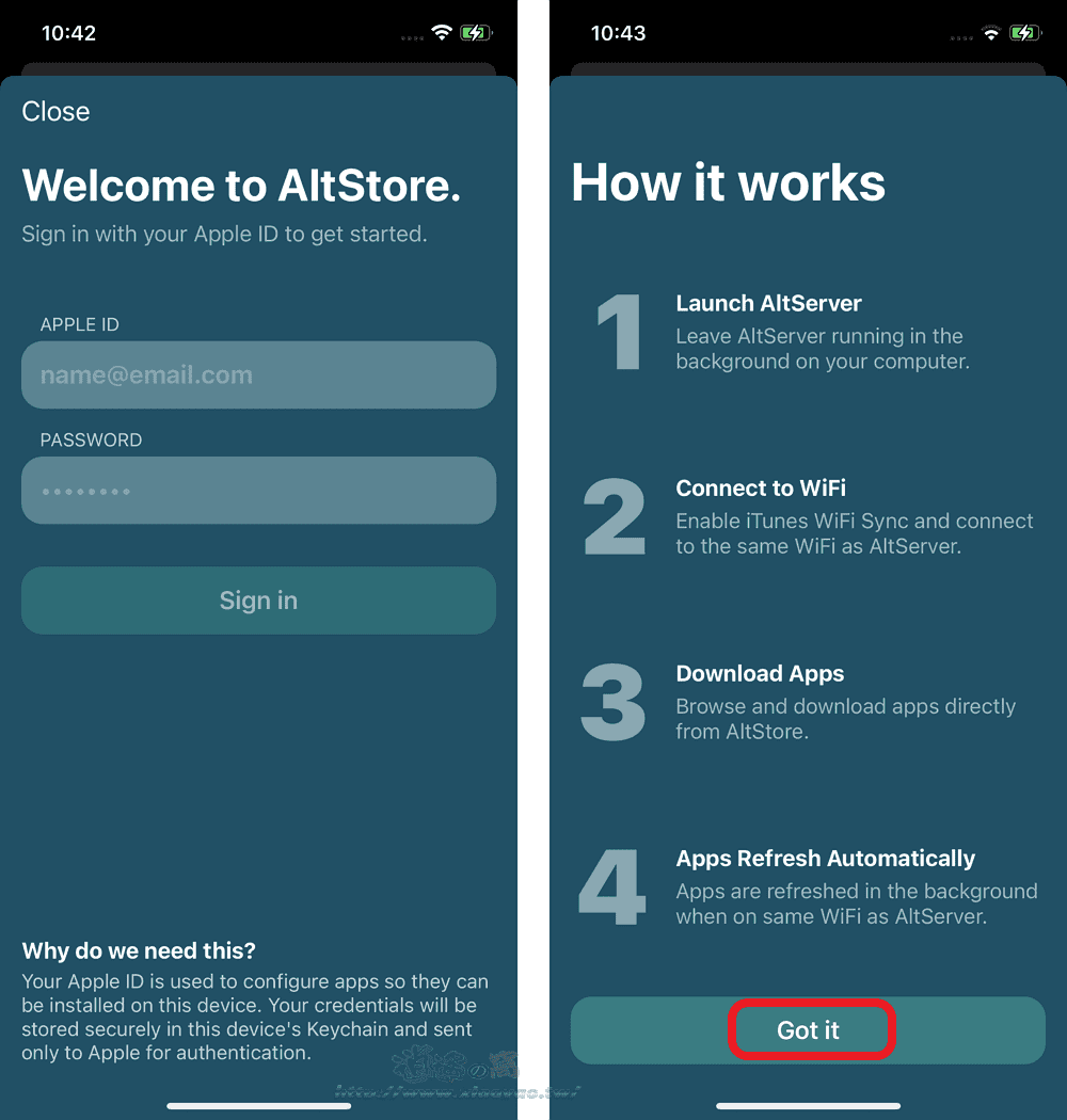 第一次使用 AltStore 安裝 App 需要登入 Apple ID 帳密,然後會有說明畫面。