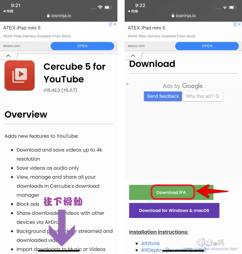 iPhone 要有安裝 AltStore 再進行以下步驟,開啟 Cercube 5 頁面往下滑動找到「Download IPA」按鍵,點擊下載 .ipa 檔案。