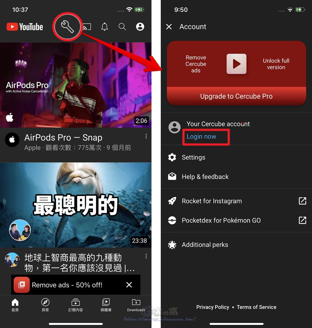 Cercube 5 整體介面與 YouTube 官方版 App 幾乎相同也能登入 Google 帳戶,觀看 YT 影片沒有廣告,只是畫面下方會有橫幅廣告,基本上不影響操作。