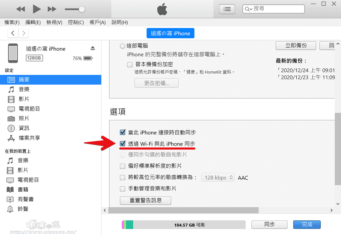 使用傳輸線連接 iPhone 與電腦時,打開 iTunes 查看裝置並勾選「透過 Wi-Fi 同步」功能。