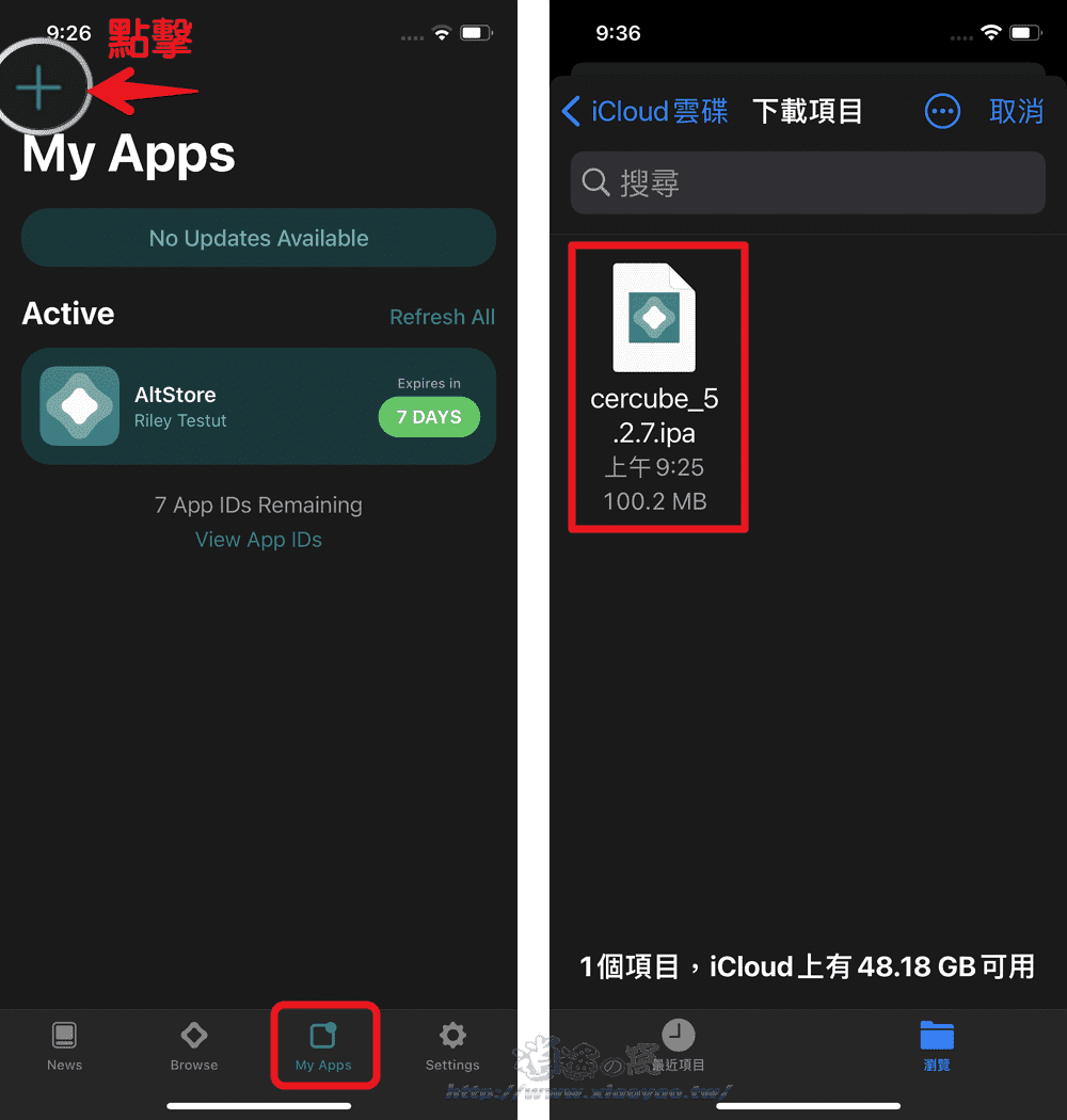 儲存 IPA 檔案後,打開 AltStore 的「My Apps」頁面,點擊左上角「+」開起 .ipa 檔進行安裝。(註:要以傳輸線連接手機和電腦,同時電腦打開 AltServer 軟體。)