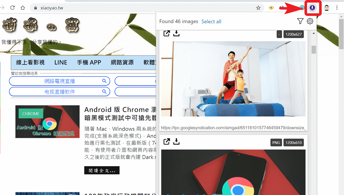 當需要儲存網頁圖片時,點擊「Imageye」圖示,會出現視窗並顯示網頁上所有圖片,包含廣告和小圖示都有。