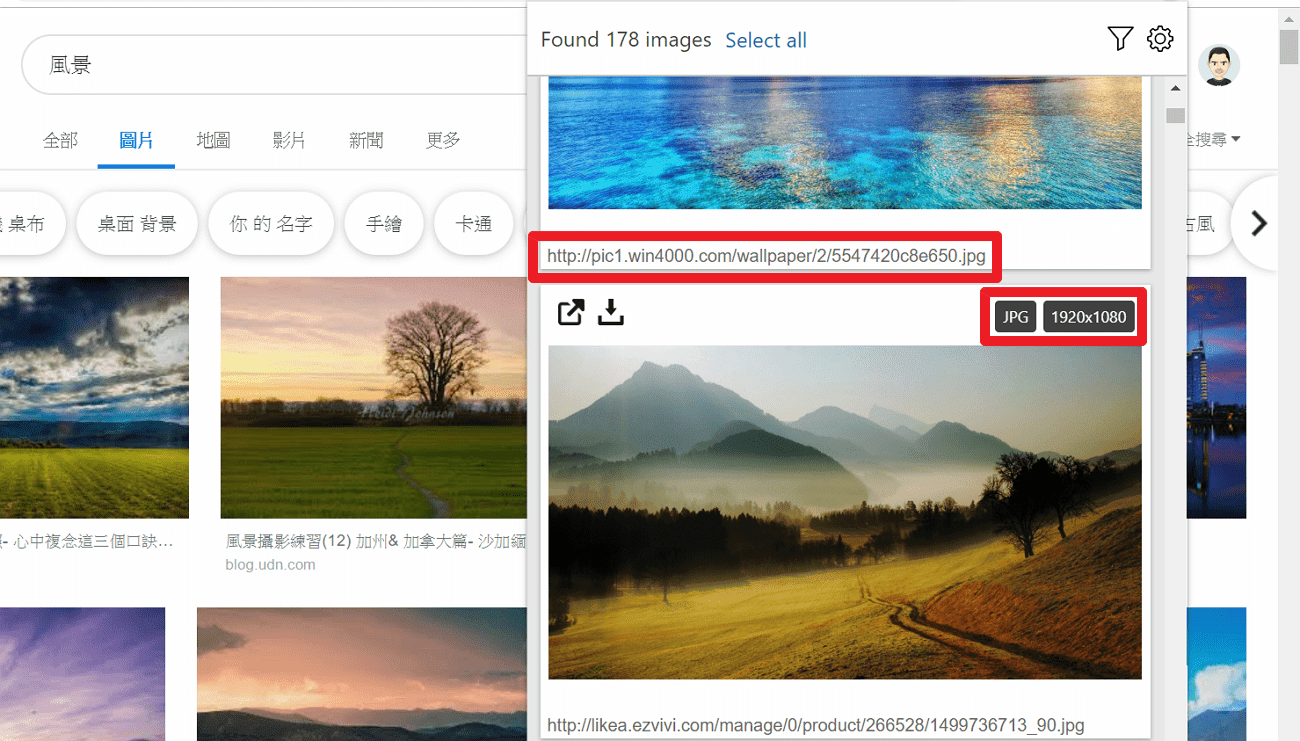 Google 搜尋圖片時也能使用「Imageye」 下載儲存,圖片會有網址、格式和尺寸大小等資訊。