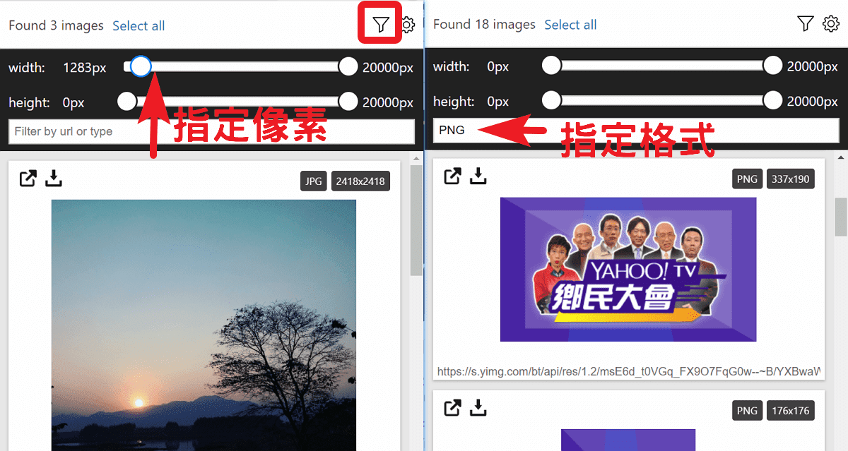 點擊「漏斗」圖示可以指定圖片像素和格式來過濾圖片,避免打包下載時儲存不需要的圖片。