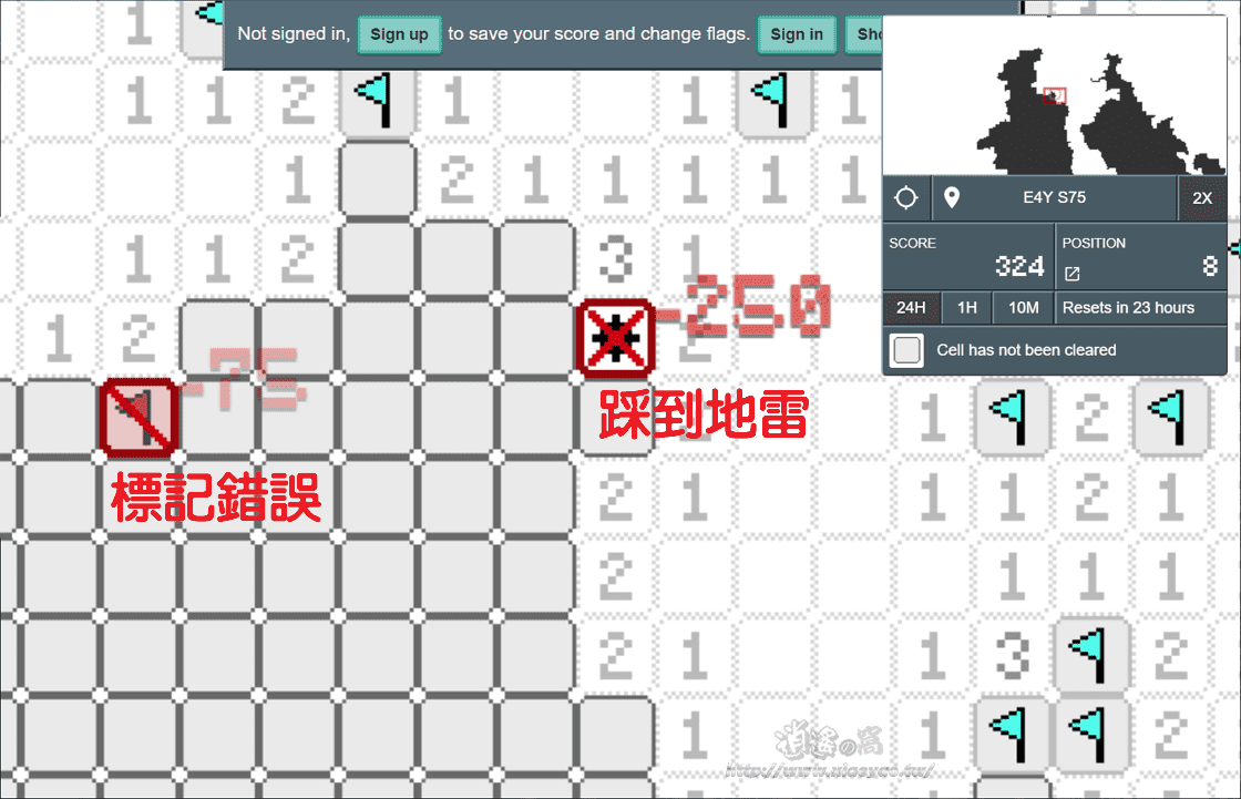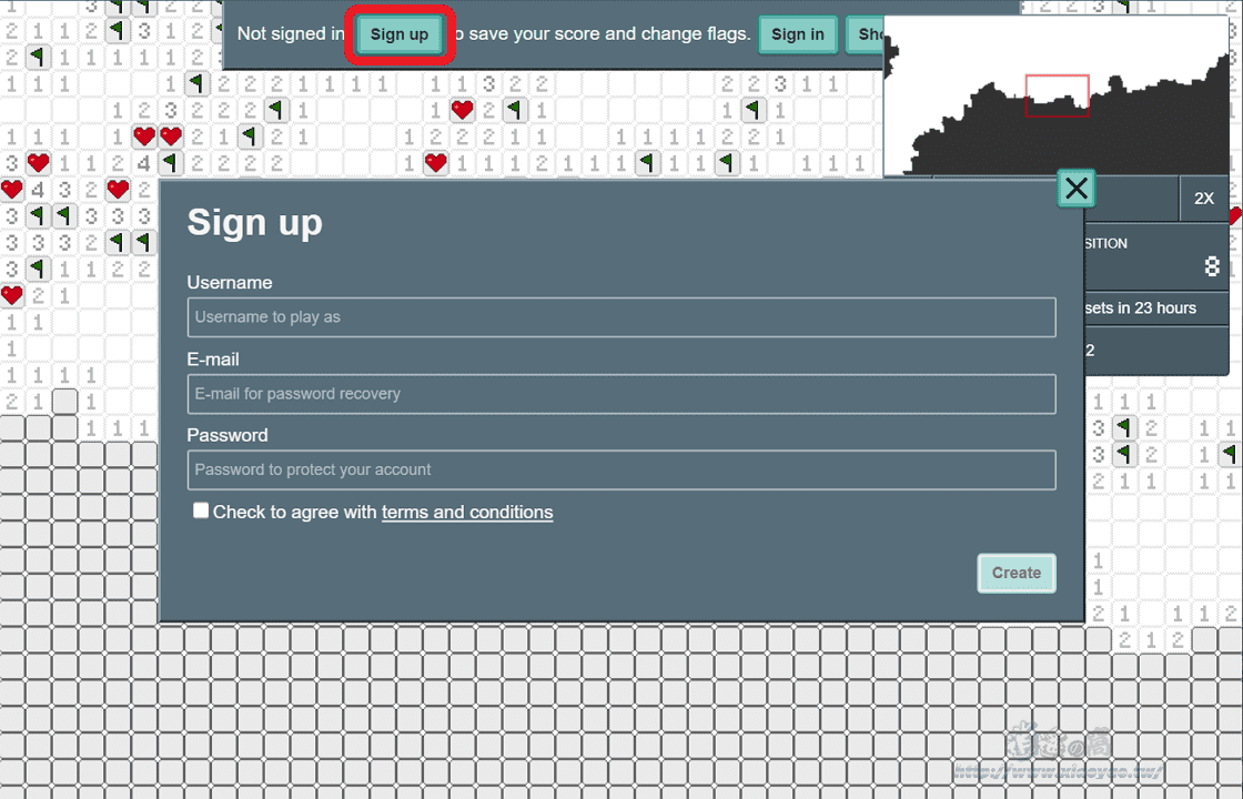 在 m3o 網站玩踩地雷不用登入,點擊「Sign up」輸入用戶名、電子信箱、密碼建立免費帳戶可以選擇標記旗幟和點開未探索區域。