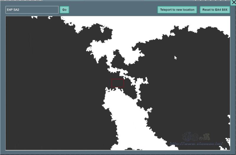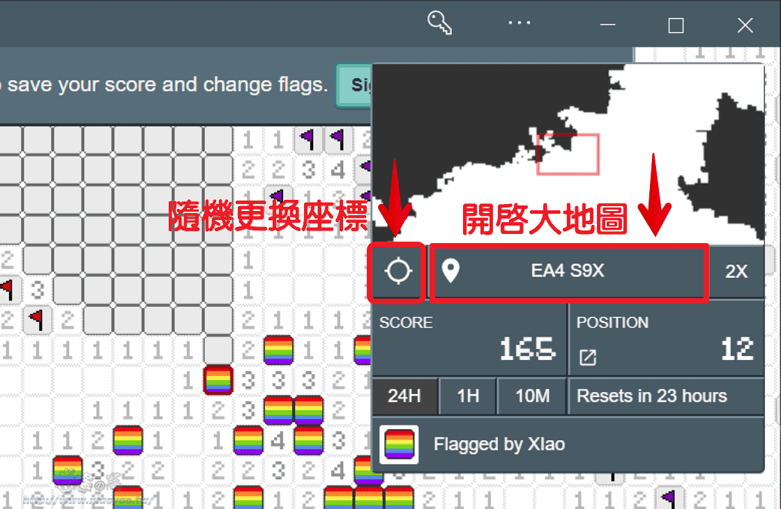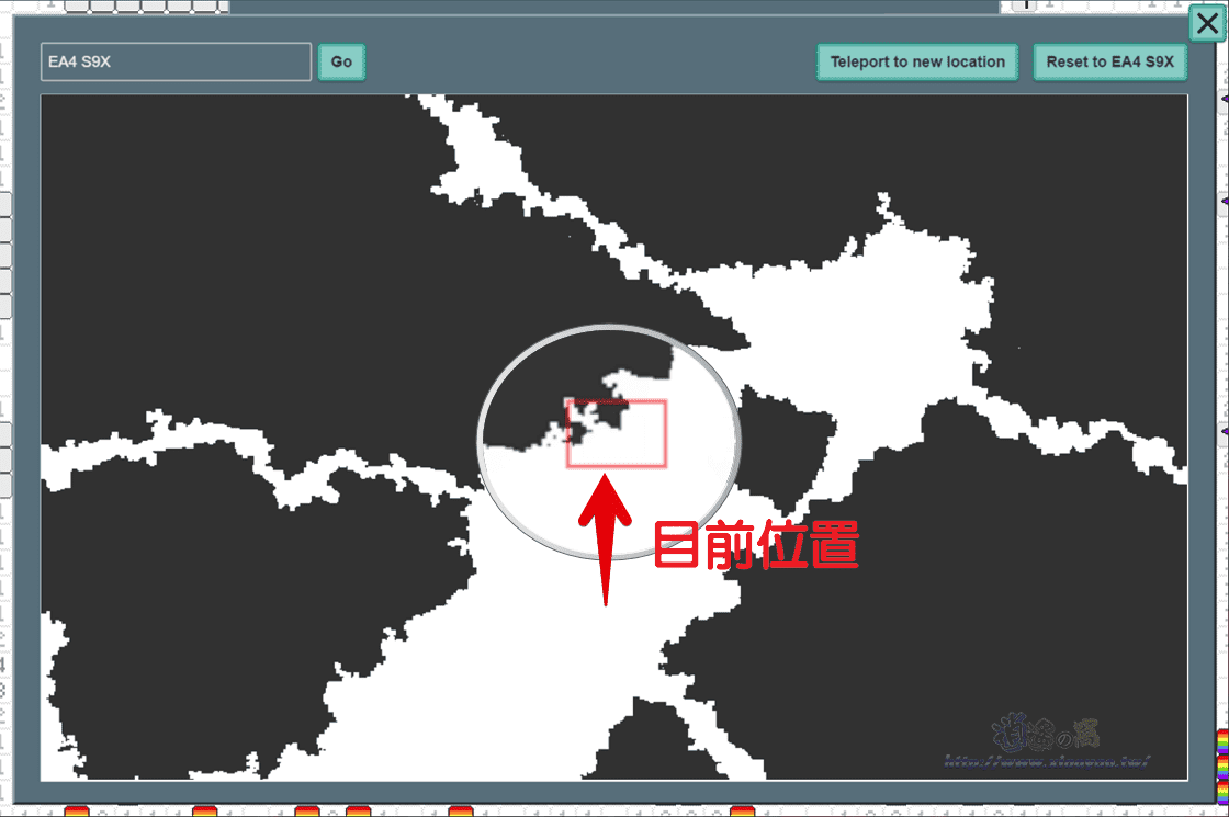 網頁右上方的小視窗會看到遊戲地圖、累積分數和排名,想要更換探索位置可以點擊隨機傳送或開啟大地圖進行移動。