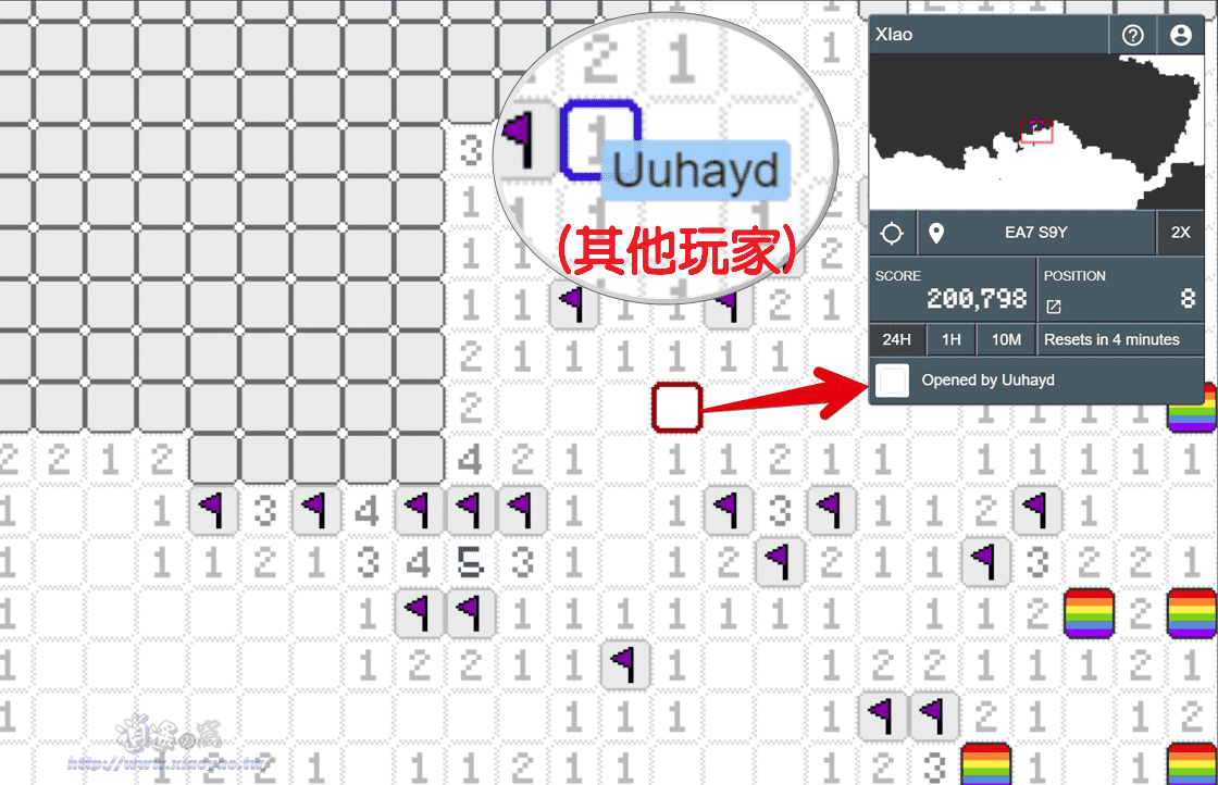 遊戲場內有可能遇見其他玩家,每一格都會標記是哪位玩家打開或標記地雷。
