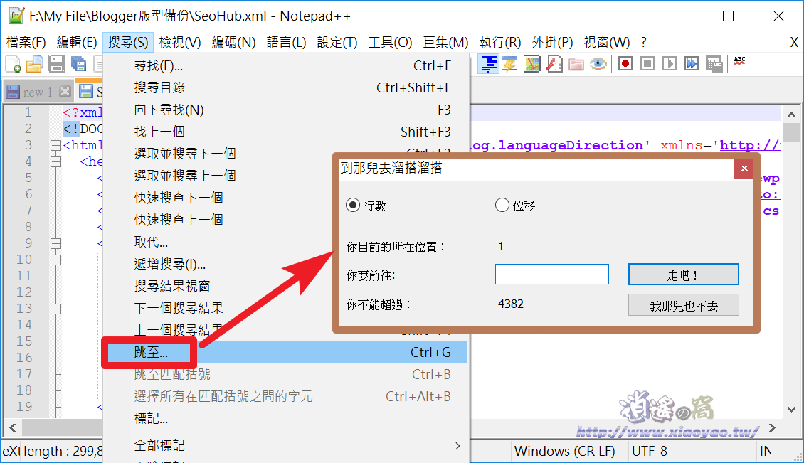 搜尋功能除了字元搜尋外,還可直接跳至指定行數。