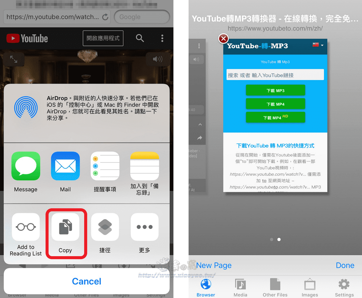 使用 MyMedia 可以從網頁下載 YouTube 影片和音樂,觀看影片時按下「分享」選擇「複製」網址,接著打開下載網站(如:YouTubeto)。