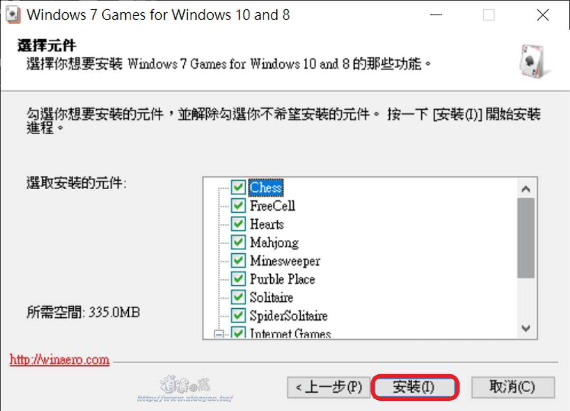 軟體預設會安裝所有遊戲,在「選擇元件」可以取消勾選不希望安裝的遊戲。