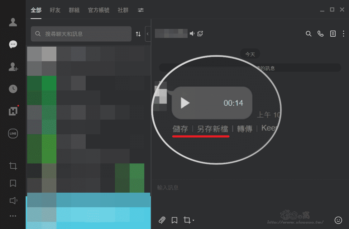 LINE 電腦版不需要額外步驟,聊天室的語音訊息會有按鈕可直接儲存檔案。