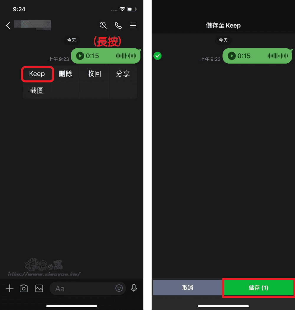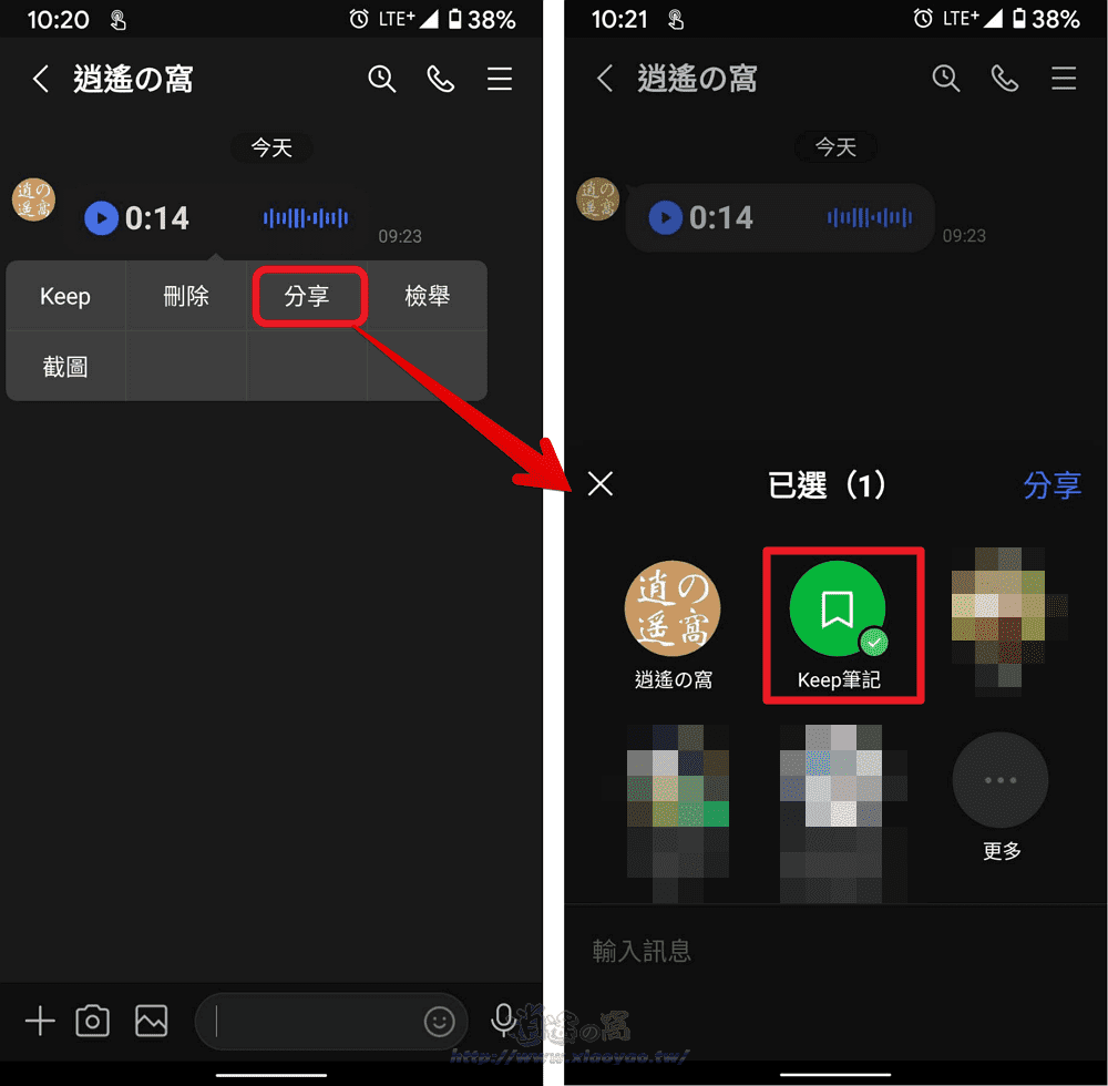或是利用 Keep 筆記也能下載語音訊息,長按「語音訊息」後點選「分享」→「Keep 筆記」。