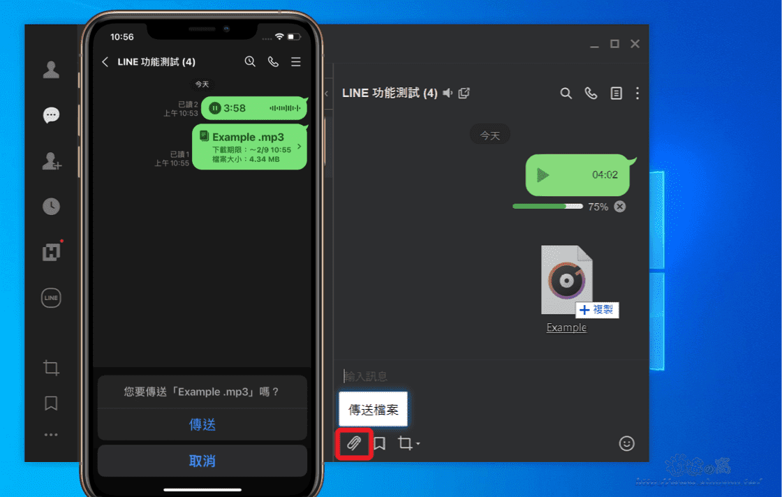電腦版點擊「傳送檔案」開啟 MP3 檔案(或直接拖曳到視窗),傳送時會進行編碼轉換成語音訊息,而手機的 LINE App 要點選「檔案」才能傳送 MP3 音訊,播放時要借助外部播放器(不是 App 內建播放功能)。