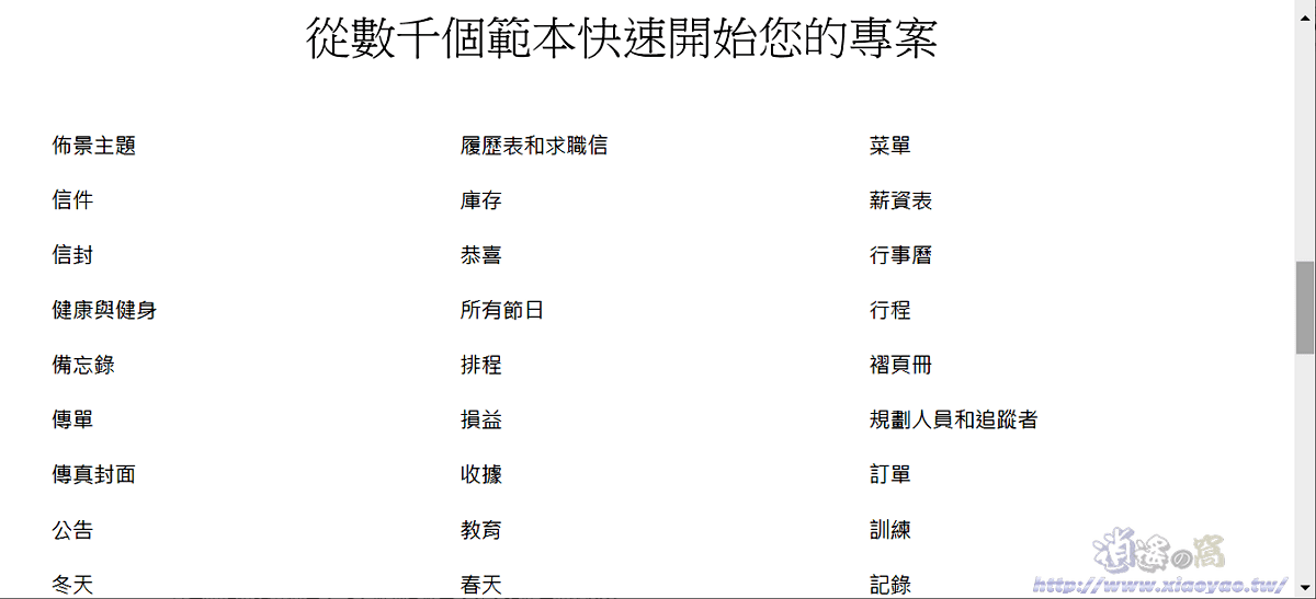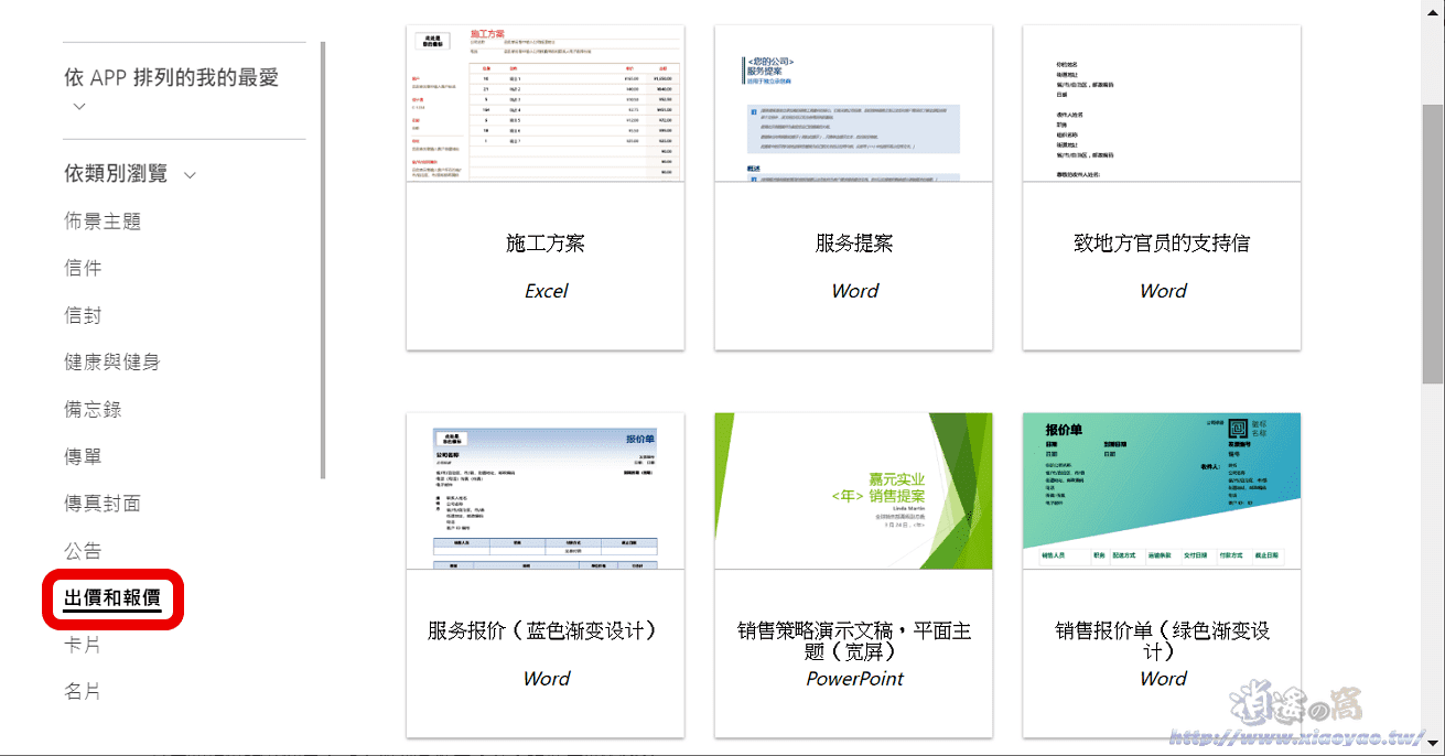 微軟 Office 官方網站提供數千個免費範本,並以分類標籤方便用戶找到適合範本,網頁瀏覽時雖然會看到簡體中文,但所有範本內容都是繁體中文,可以下載離線編輯或在瀏覽器線上編輯。