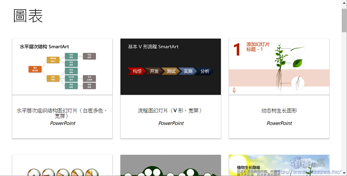 例如「圖表」有進程流程圖、雙螺旋DNA 圖形、多顏色儀表圖形、動態樹生長圖形等多種 PowerPoint 範本。