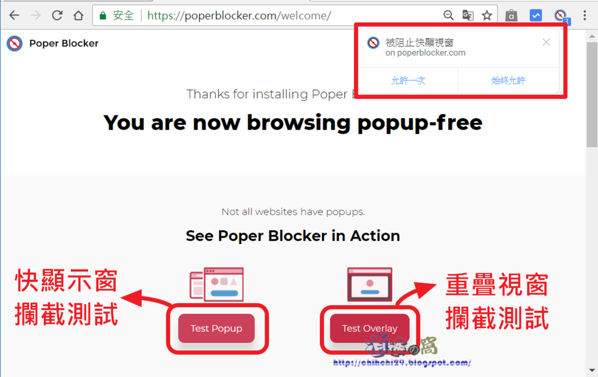 擴充功能添加後自動開啟官方測試網頁,點擊連結可測試快顯、重疊視窗攔截效果。當攔截到快顯視窗時會出現提示訊息,點選「始終允許」可將網站加入白名單,白名單網站不執行攔截動作。