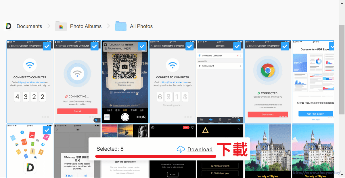 電腦端免安裝軟體,瀏覽器打開 https://docstransfer.com/ 網頁,輸入手機顯示的連線碼,兩裝置要使用相同 Wifi 連線才能連接。