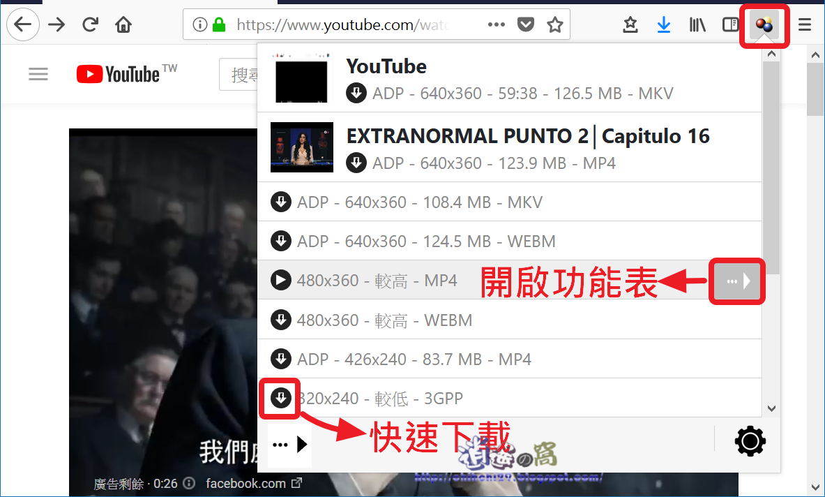 瀏覽 YouTube 網頁時可直接下載影片,也適用於 Vimeo、DailyMotion、Facebook、Vine、Twitch、UStream、Fox、RAI、Break 等數千個影音網站。【下載 Firefox 瀏覽器】