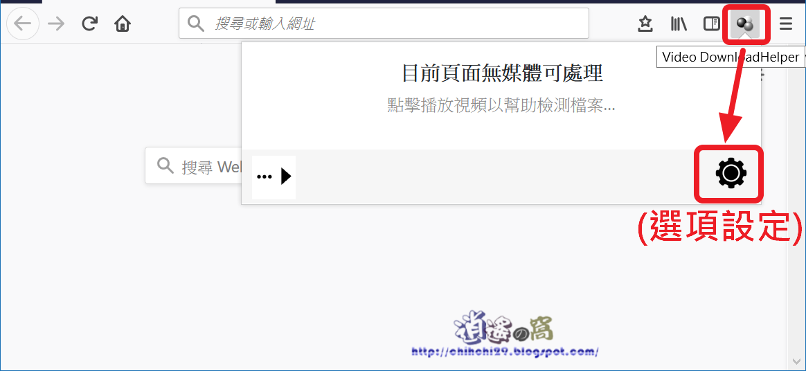 附加元件新增完成,工具列會有 Video DownloadHelper 圖示(灰色代表未偵測到媒體)。點擊圖示可查看內容,或開啟選項設定。